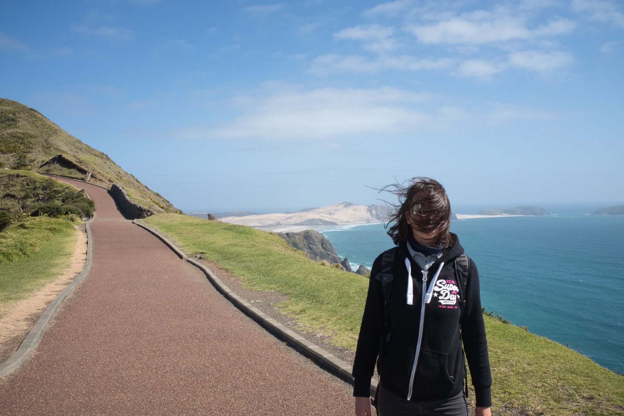Le Phare de Cape Reinga est facile d'accès, c'est aussi le point de départ du fameux trail qui traverse toute la Nouvelle-Zélande : le Te Araroa. Les paysages sont magnifiques mais il y a énormément de vent !