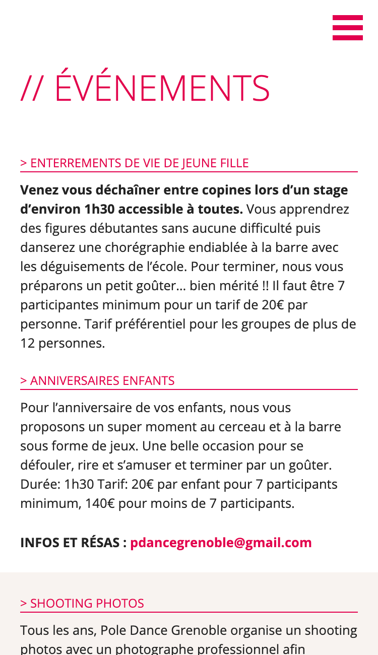 Website for a Pole Dance school in Grenoble. Based on a provided design mockup, I developed a responsive Wordpress theme.